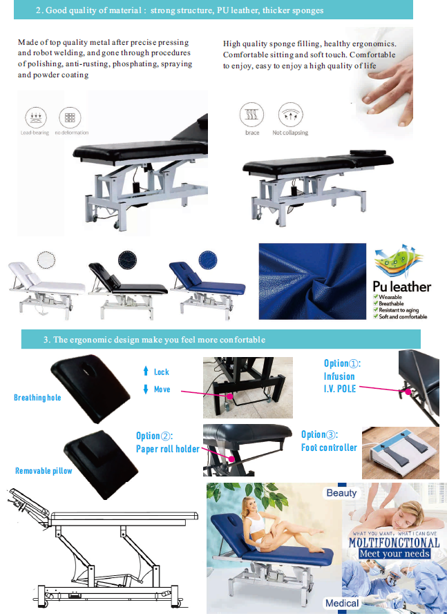 0754-88481863A quality examination table offering full stability regardless of how the patient is sitting orlying. The height is adjusted straight up and down using the foot pedal, which means the tablecan be placed against a wal1. The height is well increased both in the lowest and highest position.This mcans casicr cntry and cxit for the pationt, whilc always getting a good working posturc.